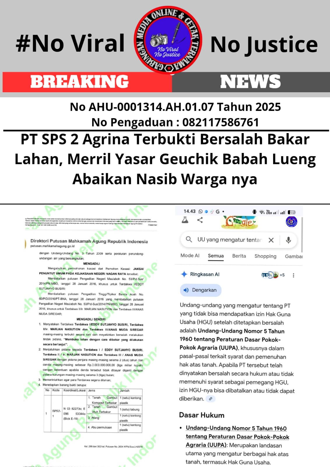 “Hingga berita ini diturunkan, baik PT SPS 2 Agrina, BPN Nagan Raya, BPN Kanwil Banda Aceh, Kepala Desa Babah Lueng, maupun Mantan Kepala Desa Babah Lueng, tidak dapat memperlihatkan bukti fisik izin HGU,” tegas Asep NS.