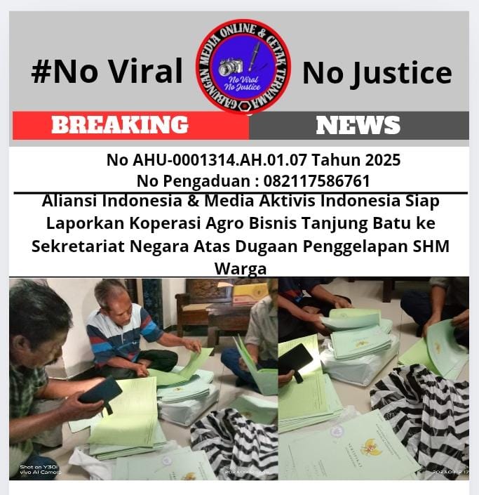 Mata-publiknusantara.com, Tanjung Batu, Kalimantan Timur – Lembaga Aliansi Indonesia dan Media Aktivis Indonesia (LAI & MAI) berencana melaporkan Koperasi Agro Bisnis Tanjung Batu ke Sekretariat Negara atas dugaan penggelapan Sertifikat Hak Milik (SHM) tanah milik puluhan warga di Tanjung Batu, Kec. Pulau Derawan, Kab. Berau, Kalimantan Timur. Informasi ini diperoleh GMOCT (Gabungan Media Online dan Cetak Ternama) dari media online Eksposelensa yang tergabung di dalamnya.