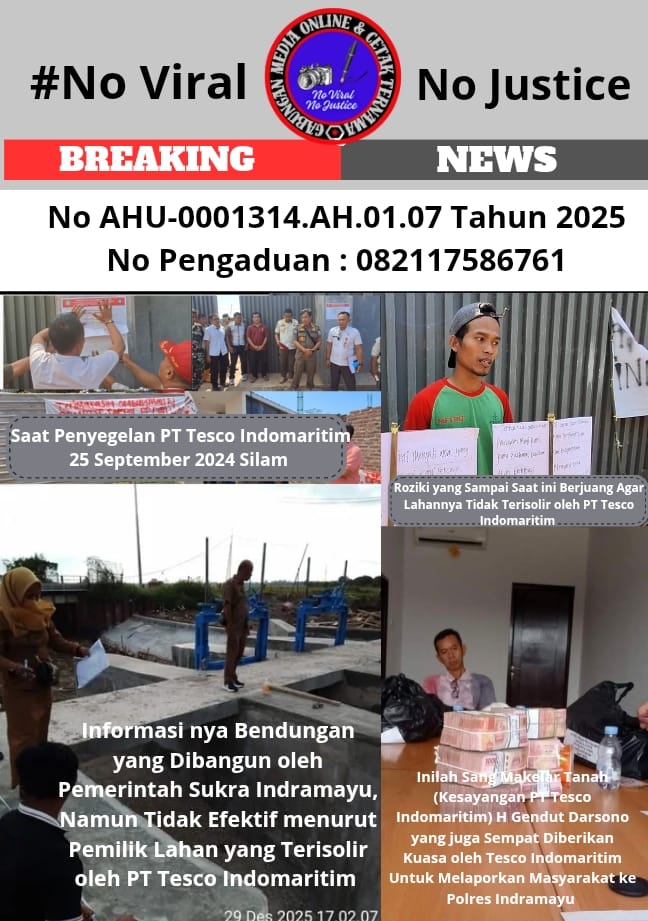 Mata-publiknusantara.com, Indramayu – Sengketa lahan yang melibatkan 4 ahli waris warga Desa Tegal Taman, Kecamatan Sukra, Kabupaten Indramayu akibat pembangunan PT Tesco Indomaritim kembali muncul dengan perkembangan baru. Berdasarkan hasil monitoring Ombudsman RI tertanggal 25 September 2024, perusahaan tersebut tidak memiliki perijinan dasar, yang kemudian menjadi dasar bagi Satpol PP dan Dinas DPMPTSP Kabupaten Indramayu untuk melakukan penyegelan dan penghentian aktivitas sementara. Namun, penyegelan tersebut diduga hanya formalitas karena perusahaan kembali beroperasi setelah dikunjungi oleh Mantan Bupati Indramayu Nina Agustina sebelum digantikan oleh Lucky Hakim.(sumber Diskominfo Indramayu)