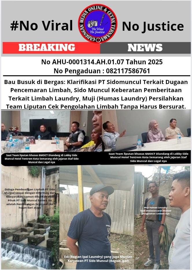 Mata-publiknusantara.com Semarang, 11 Juni 2025 (GMOCT) – Laporan awal dari masyarakat mengenai bau busuk menyengat di Bergas, Kabupaten Semarang, yang diduga berasal dari limbah PT Sidomuncul, telah memicu kontroversi dan kekhawatiran publik. GMOCT (Gabungan Media Online dan Cetak Ternama), yang sebelumnya melaporkan dugaan pencemaran tersebut, kini telah melakukan investigasi lanjutan dan bertemu langsung dengan perwakilan PT Sidomuncul.
