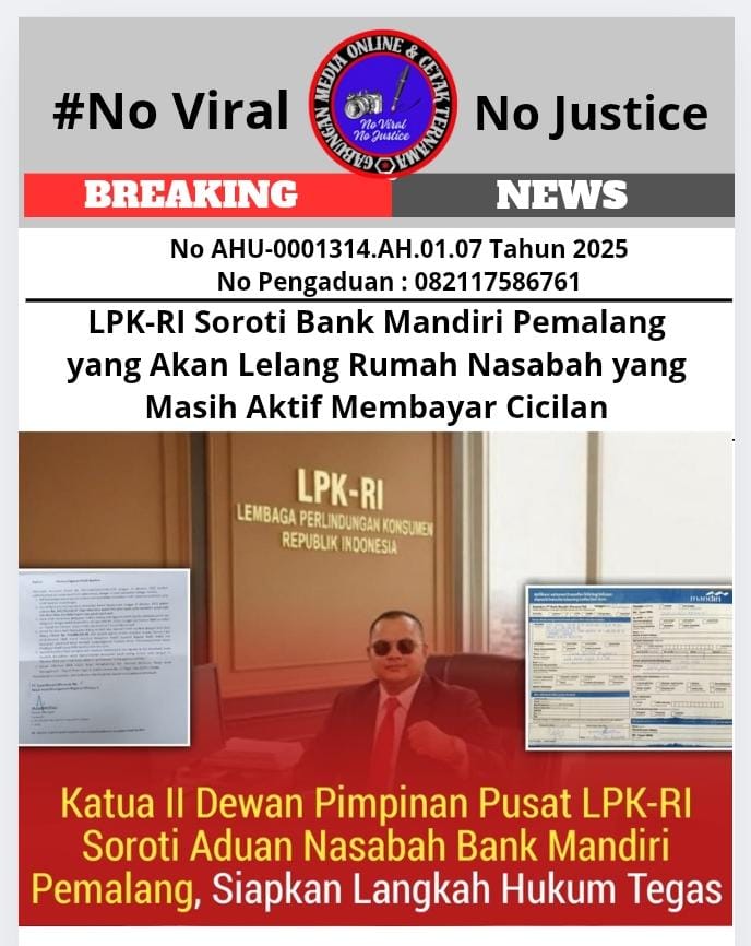 Mata-publiknusantara.com, PEMALANG, (GMOCT) — Lembaga Perlindungan Konsumen Republik Indonesia (LPK-RI) menyoroti serius aduan seorang nasabah Bank Mandiri Cabang Pemalang yang rumahnya hendak dilelang, padahal masih aktif membayar cicilan kredit setiap bulan. Ketua II DPP LPK-RI, Agung Sulistio, memastikan pihaknya telah menerima laporan resmi dan akan menindaklanjuti kasus tersebut dengan langkah hukum yang tegas. Informasi ini diperoleh Gabungan Media Online dan Cetak Ternama (GMOCT) dari media online kabarSBI.com yang tergabung di dalamnya.