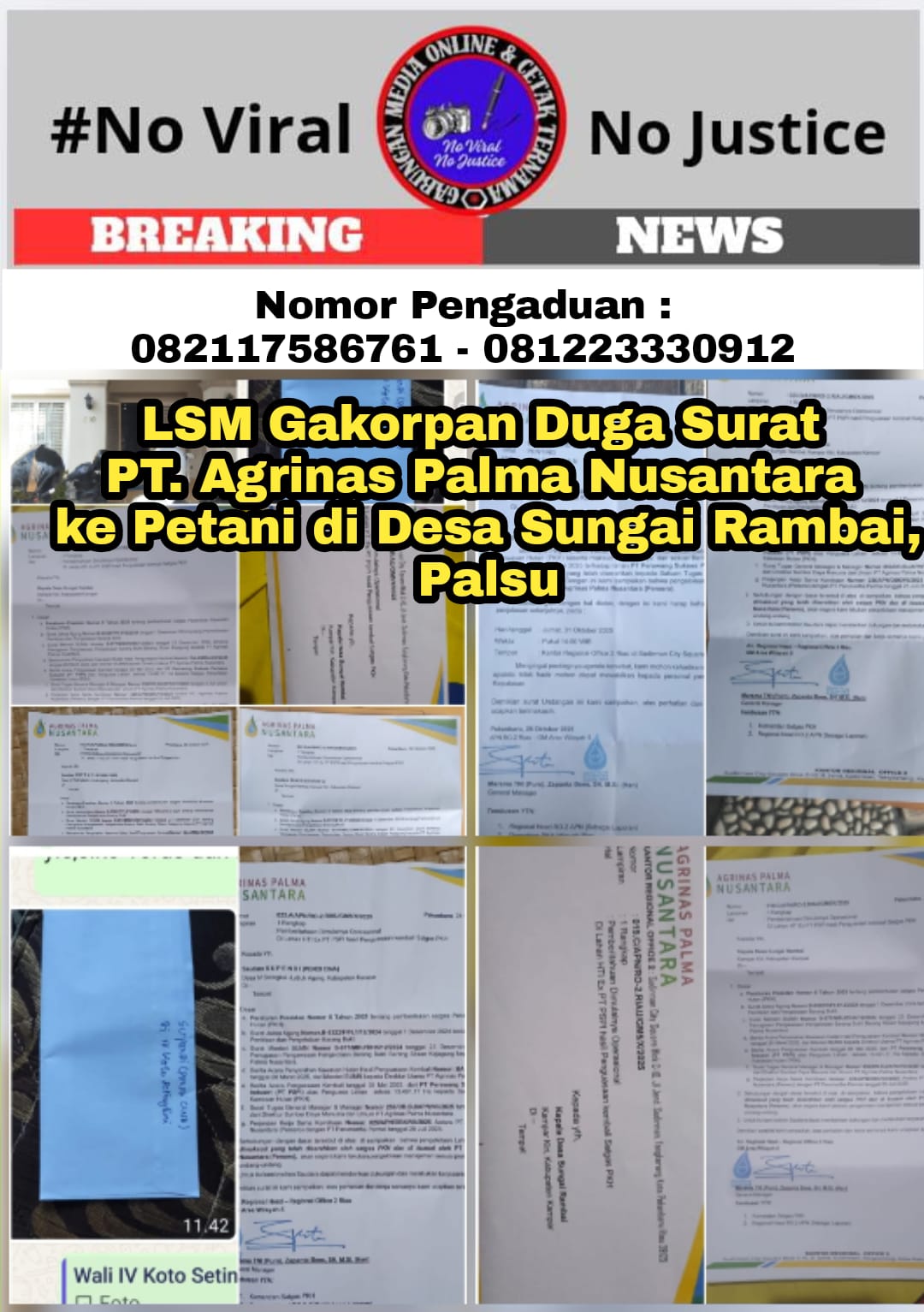 Terakhir, tambahnya, bahwa LSM Gakorpan menerima informasi, bukan pihak PT. Agrinas yang mengantarkan surat ke Kepala Desa untuk disampaikan ke para petani, tetapi pihak KSO, PT. Parumartha Permai yang diduga bernama Gultom.