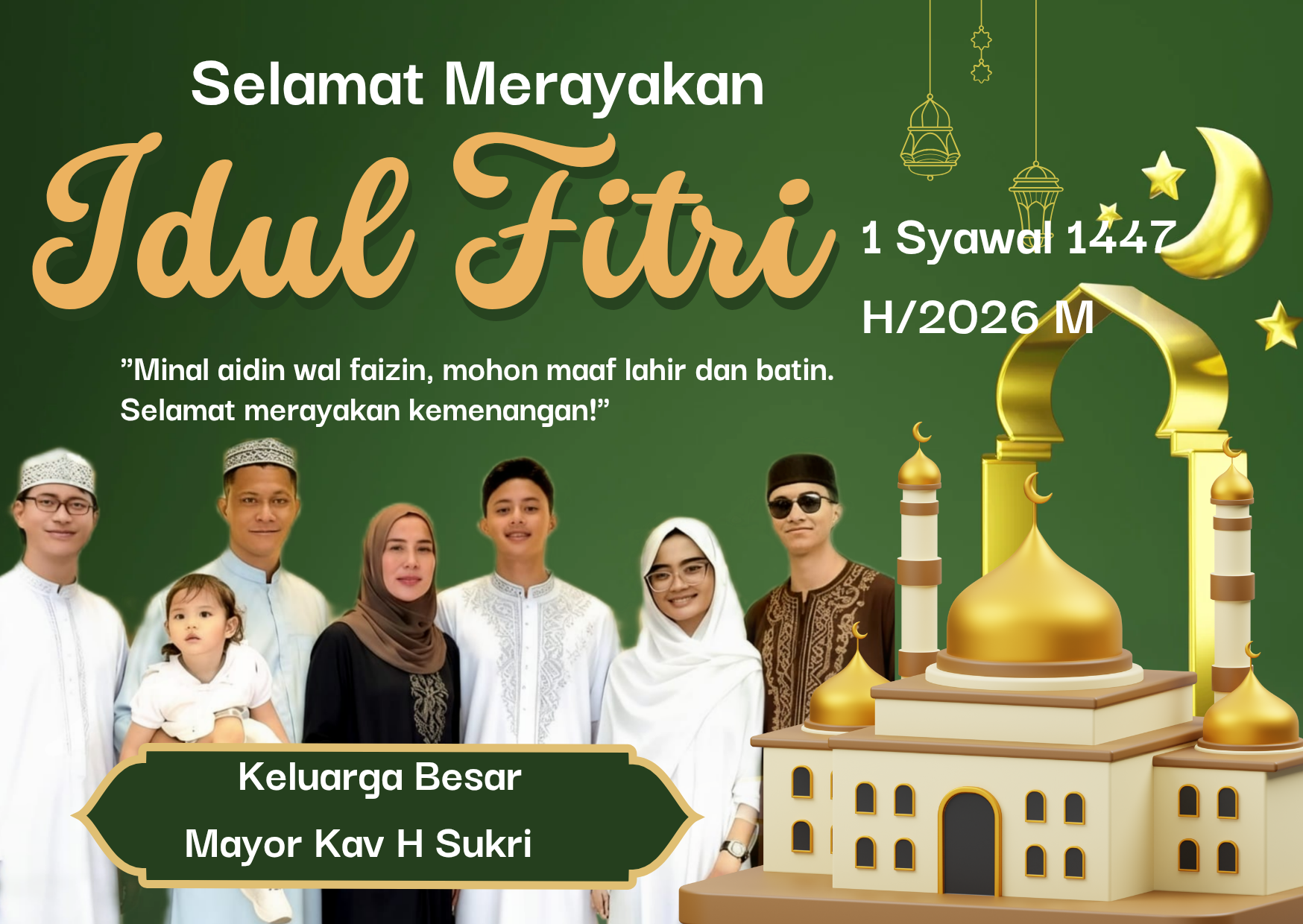 Dengan penuh rasa syukur atas rahmat dan karunia Allah SWT yang tak pernah putus, Keluarga Besar Mayor Kav H Sukri mengucapkan Selamat Hari Raya Idul Fitri 1 Syawal 1447 H / 2026 M.